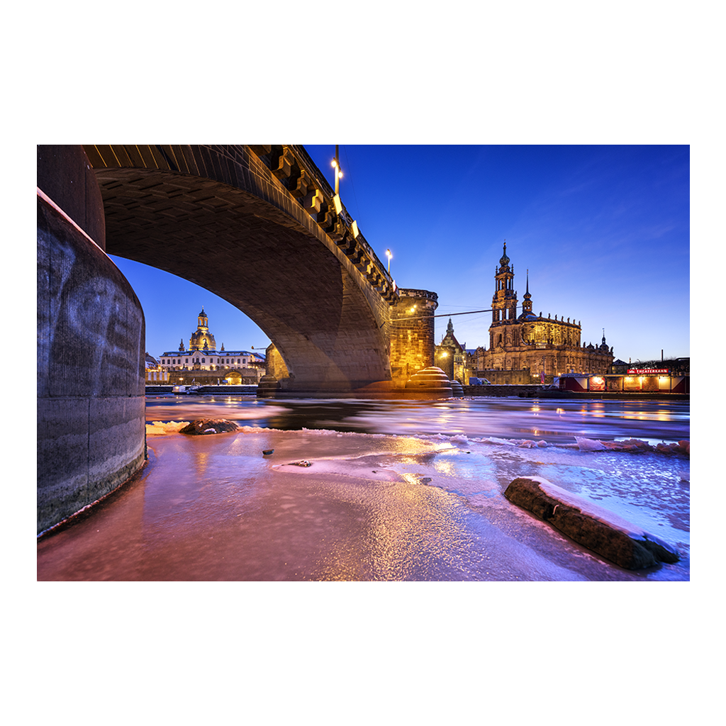 An einem kalten Winterabend in Dresden, umhüllt die Blaue Stunde die Elbe in einem zauberhaften, tiefblauen Schimmer. Im Vordergrund glitzern Eisschollen auf der halb gefrorenen Elbe, ihre Oberflächen schimmern in sanften Rosa- und Blautönen, als ob sie das letzte Licht des Tages einfangen.