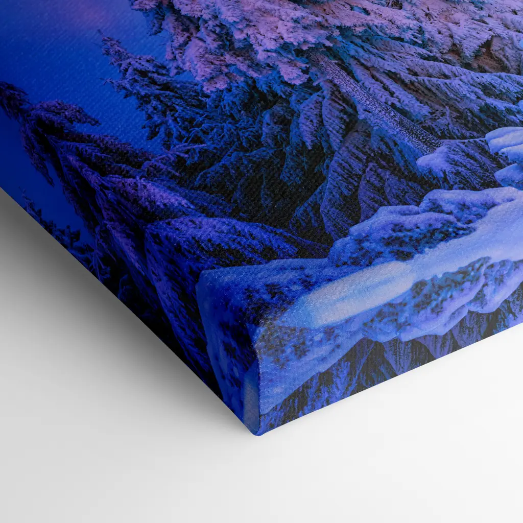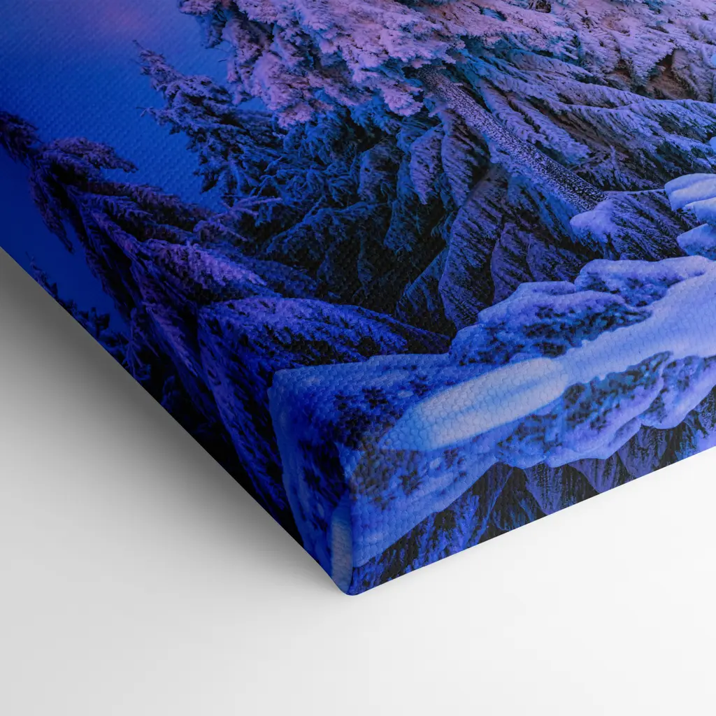 Das Bild fängt die eisige Stille perfekt ein: tiefblaue Dämmerung, funkelnder Schnee und der leuchtende Hof um den Mond – pure Wintermystik.