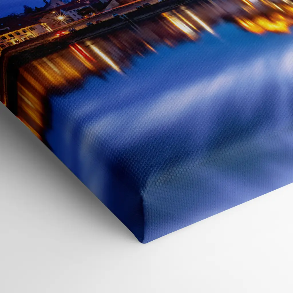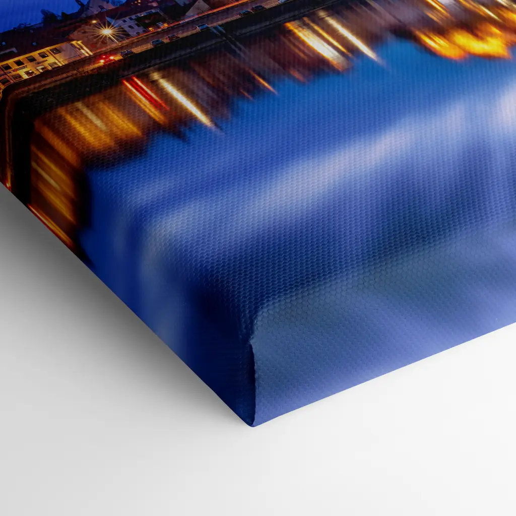 Eine außergewöhnlich lange Belichtungszeit von 2 Minuten und 30 Sekunden hat die Wolken in sanfte, fließende Streifen verwandelt – ein dramatischer Himmel aus leuchtendem Blau und zarten weißen Bewegungsspuren, der dem Bild eine fast magische, zeitlose Qualität verleiht. Die Lichter der Stadt und des Schlosses ziehen sich als leuchtende Bänder und funkelnde Reflexionen über das Wasser, während die ruhige Oberfläche der Elbe das gesamte Szenario wie ein lebendiges Gemälde verdoppelt.