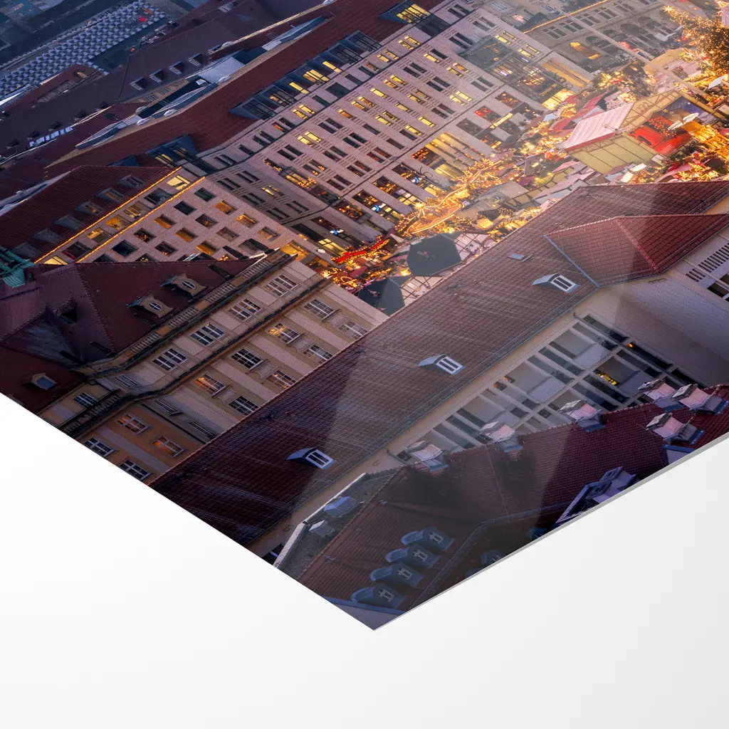 Unten auf dem Altmarkt strahlt der Weihnachtsmarkt in warmem Gold: Zahlreiche Buden mit rot-weißen Dächern sind festlich beleuchtet, dazwischen thront ein prächtiger, riesiger Weihnachtsbaum, dessen Lichterketten wie Sterne funkeln. Ein Riesenrad dreht sich langsam und verleiht dem Ganzen eine verspielte Dynamik.