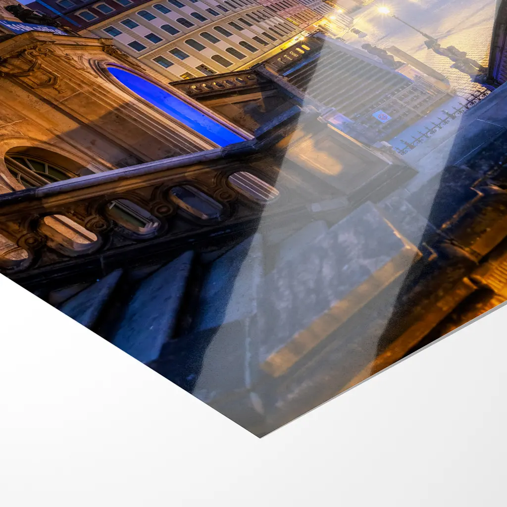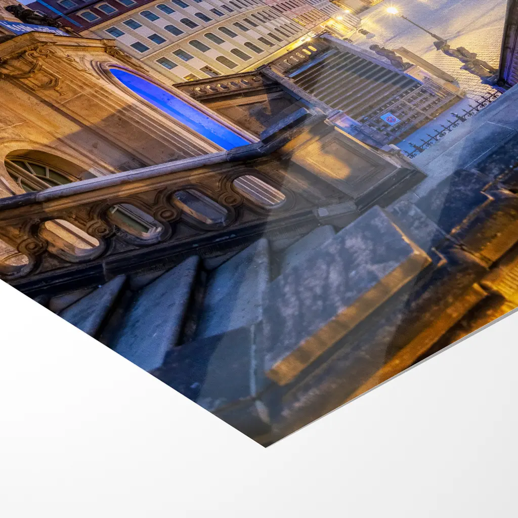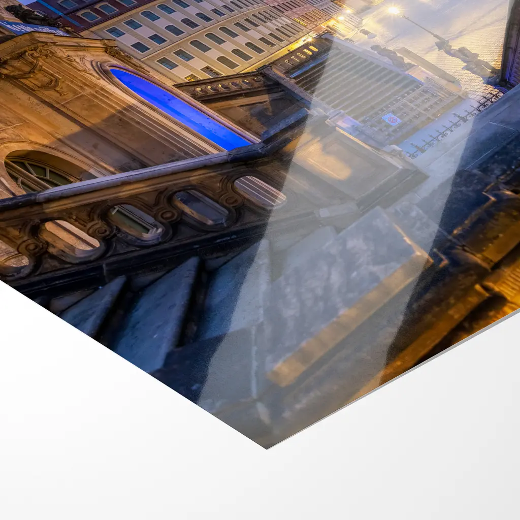 In der zarten Blauen Stunde, kurz vor dem ersten Gold des Morgens, liegt der Dresdner Neumarkt in stiller, fast überirdischer Ruhe. Von den geschwungenen Treppen des Verkehrsmuseums blickt man hinab auf das weite, leergefegte Pflaster des Platzes, das im kühlen Blauviolett des frühen Himmels sanft schimmert.