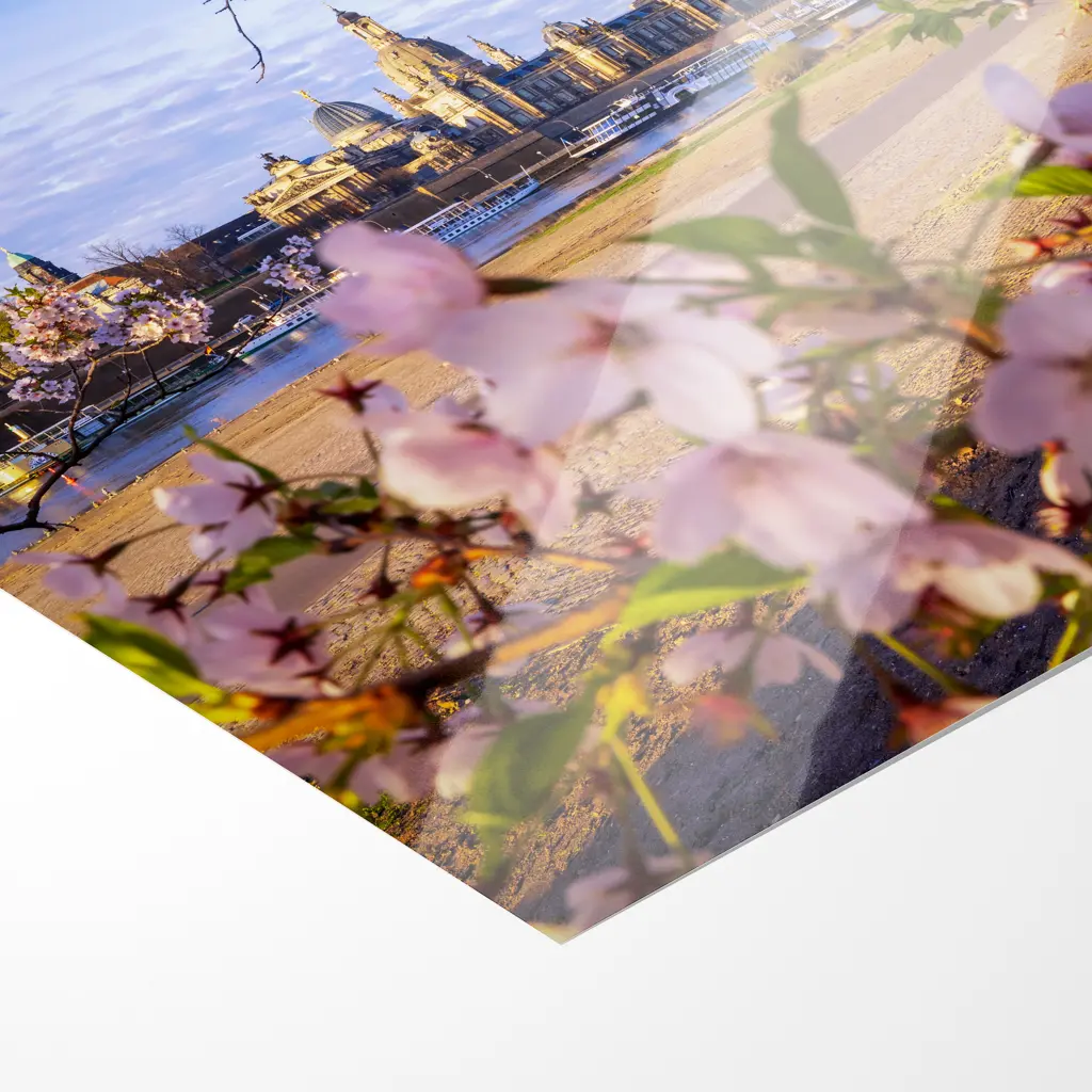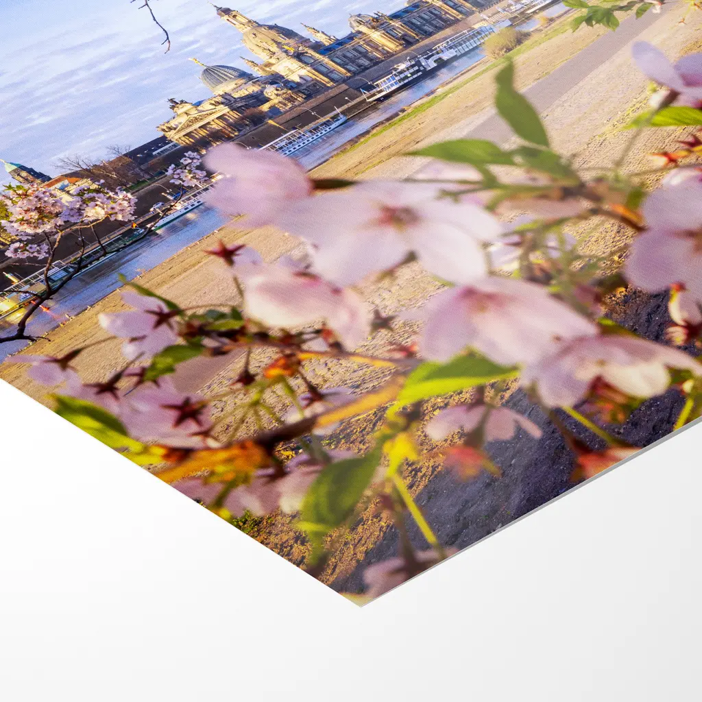 Früh am Morgen, wenn die ersten goldenen Strahlen der aufgehenden Sonne die Elbe und die barocke Skyline von Dresden sanft streicheln, öffnet sich ein zauberhafter Blick vom Königsufer aus. Im Vordergrund rahmt ein üppig blühender Kirschbaum das Bild ein – zarte rosa-weiße Blüten hängen schwer an den Ästen und lassen die Szene wie aus einem Traum wirken.