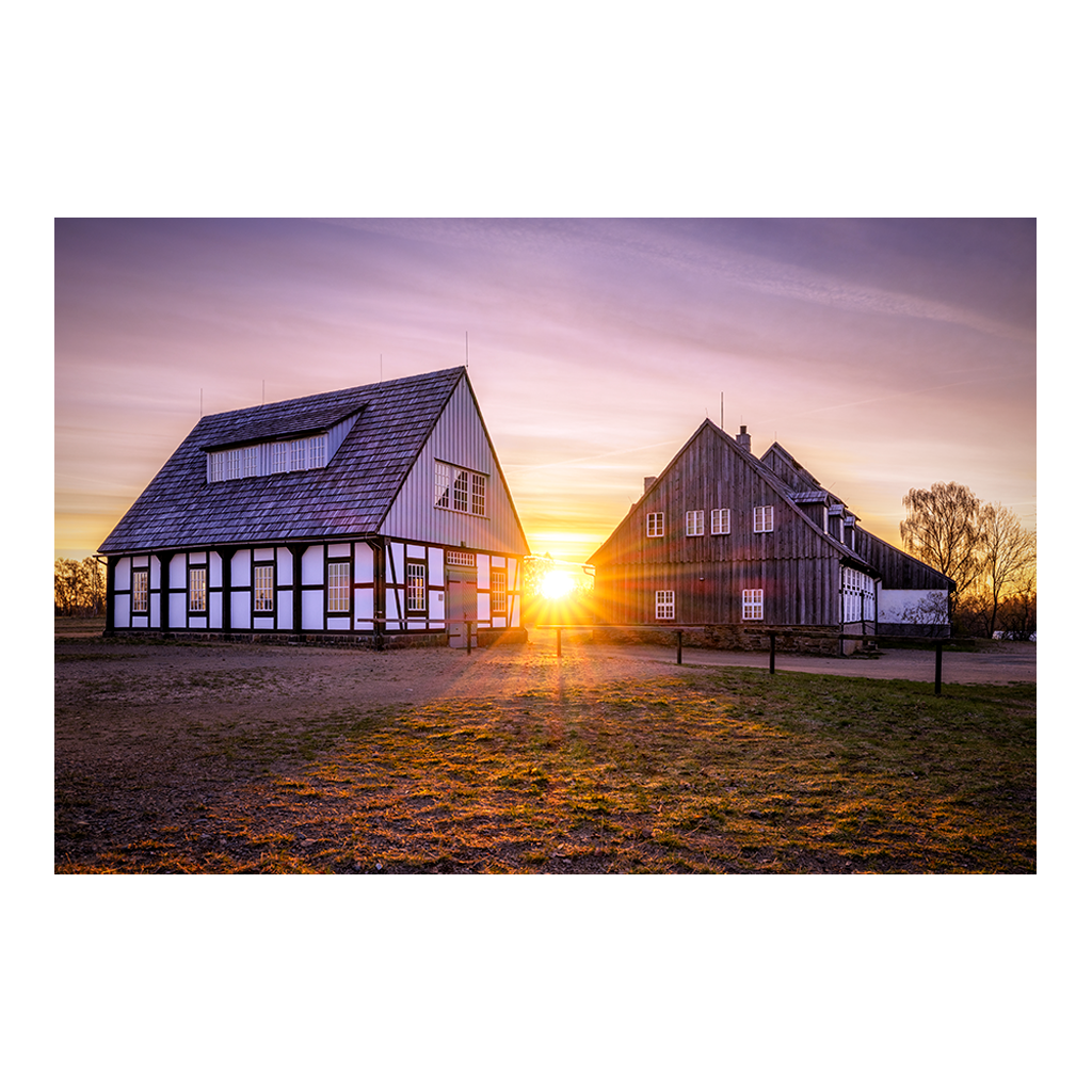 Links das helle Fachwerkgebäude – das Gebläsehaus – mit seinen klaren weißen Wänden und dunklen Balken. Rechts das dunkle, imposante Huthaus mit dem angrenzenden Treibhaus, dessen wettergegerbtes Holz im Gegenlicht besonders eindrucksvoll wirkt. Der tiefe, goldene Sonnenschein lässt das Gras leuchten und erzeugt einen beeindruckenden Strahlenkranz um die Sonne.