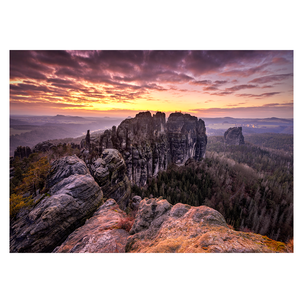 Das Bild zeigt die Schrammsteine in der Sächsischen Schweiz beim Sonnenuntergang. Diese markanten Sandsteinfelsen, Teil des Elbsandsteingebirges, sind bekannt für ihre beeindruckenden, turmartigen Formationen und gelten als beliebtes Ziel für Kletterer und Wanderer. Im Vordergrund ragen die schroffen Felsen auf, teilweise mit Moos und spärlichem Pflanzenwuchs bedeckt. Im Hintergrund erstreckt sich ein bewaldetes Tal mit sanften Hügeln und einer fernen Ansiedlung. Der Himmel leuchtet in Rot-, Orange- und Pinktönen, während die untergehende Sonne die Szenerie in warmes Gold taucht, für eine friedliche und majestätische Atmosphäre.