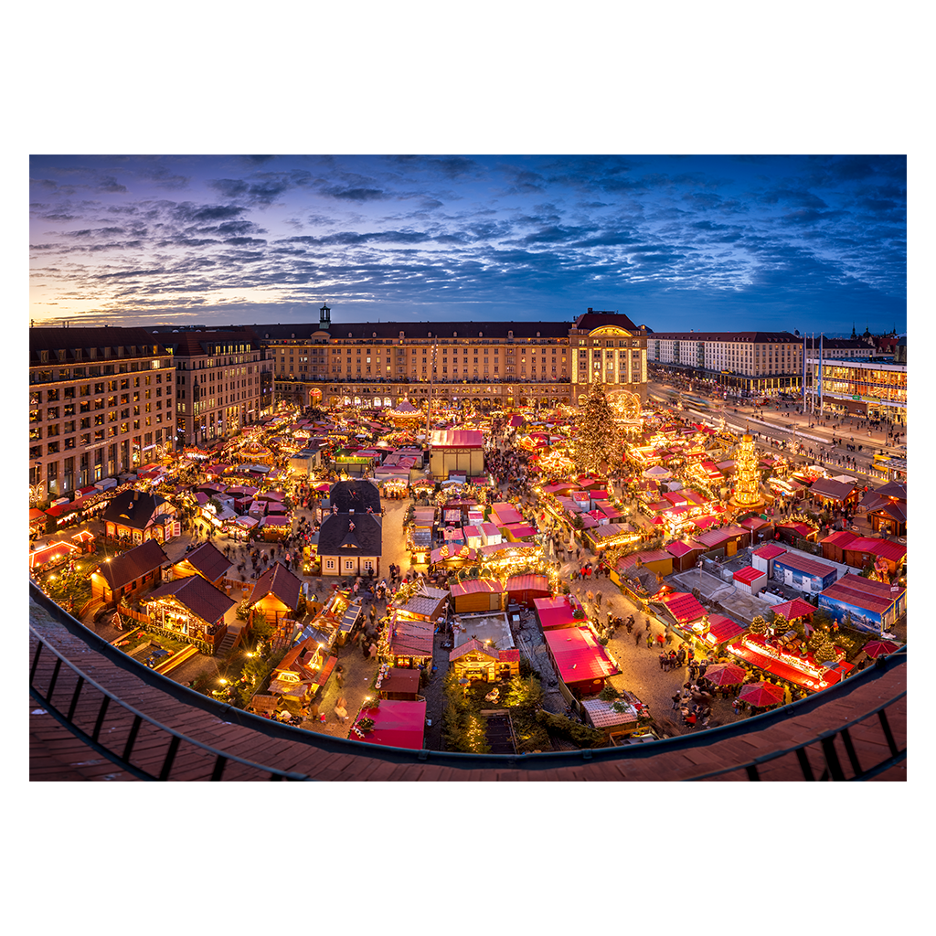Vom Fenster des Star G Hotels am Altmarkt eröffnet sich ein zauberhafter Blick auf den Dresdner Striezelmarkt in der blauen Stunde. Der Himmel glüht in sanften Orange- und Rosatönen, während Hunderte rote Holzhütten in goldenem Licht erstrahlen. Lichterketten funkeln wie Sterne, ein prächtiger Weihnachtsbaum thront in der Mitte, und ein Riesenrad dreht sich gemächlich.