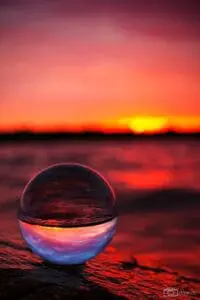 Lars hatte dann noch die Idee mit unser Glaskugel die wir immer dabei haben. So entstand kurz nach Sonnenuntergang ein schönes Glaskugelbild am Ufer des Senftenberger See. durch die physikalische Brechung des Lichtes im inneren der Glaskugel, steht das Bild darin auf dem Kopf. Je nach Stimmung des Bildes entscheiden wir uns immer wie wir damit verfahren. Bei einigen Bilder haben wir das Bild in der Kugel auch um 180° gedreht. Bei diesem blieb aber alles wie im Original. Damit die Glaskugel nicht wegrollt, legen wir oft einen kleinen Stein vor die Kugel. Sehr gut eignet sich aber auch eine kleine Unterlegscheibe auf die man die Kugel drauflegen kann. In unserem Fall war der Stein aber zu steil, aus diesem Grund musste ein klein Stein herhalten.