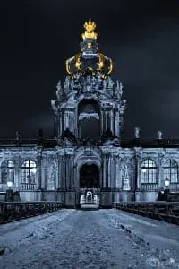 Doch als wir in der Innenstadt angekommen waren war die Enttäuschung dann doch schon sehr groß. Von dem anfänglichen Schneetreiben in Heidenau war in Dresden weit und breit nichts mehr zu sehen. Nur auf den Grünflächen lagen noch vereinzelt ein paar Flocken. Wie bei den meisten starken Wetterphänomenen ist der Schneesturm mal wieder an Dresden vorbei gehuscht. Trotzdem entschlossen wir uns einige Fotos in der Stadt zu machen. Herausgekommen ist am Ende ein Foto des Kronentors welches zum Dresdner Zwinger gehört. Wir haben das Foto in ein Schwarz/Weiß umgewandelt und anschließend eine blaue Volltonebene darüber gelegt. Anschließend wurden die Bereich in denen das Gold zu sehen ist auf dem Schwarz/Weiß Foto wegradiert sodass die goldene Farbe des Originalbildes wieder hindurchschaut.
