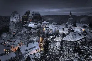 Bei diesem Bild haben wir alles zu einem dezenten HDR verarbeitet, anschließend wurde das Ganze in Schwarz/Weiß Töne umgewandelt und ein blauer Fotofilter übergelegt. In diesem Filter wurden mittels Auswahlwerkzeug die warm leuchtenden Fenster wieder herausradiert so das die Fenster vom Originalfoto hindurch scheinen konnten.